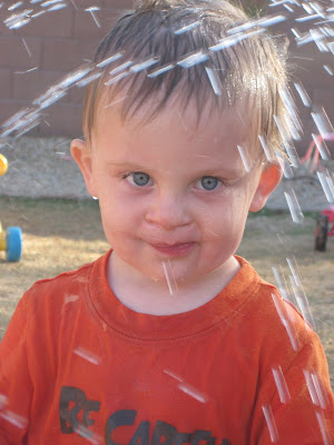 For several reasons, (wanting to water our poor, poor grass AND let the kids have some fun) I turned on a sprinkler in the backyard a few weeks ago. As evidenced by the photos below, the boys LOVED it.